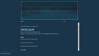 Swigian is a minimalist text adventure. It is long, but quickly finished, with few words and few complications.